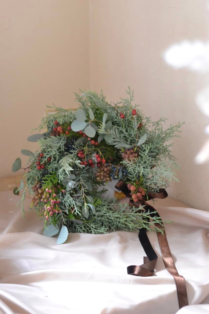 この時期に飾りたくなる香りの良いフレッシュグリーンのリース