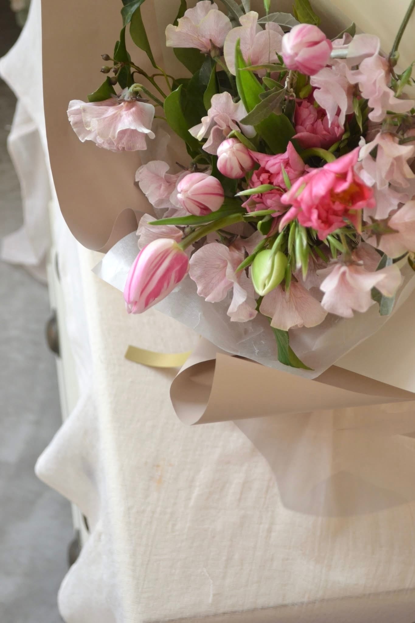 ブーケは春のチューリップやスイートピーを束ねて発送します