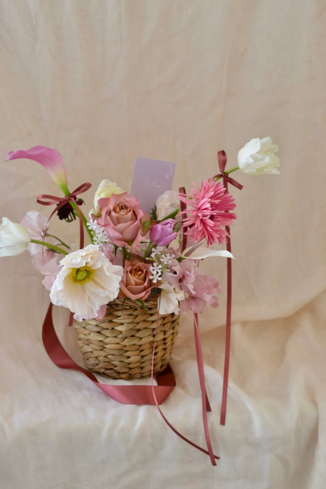 さえっこらしい柔らかいお花を選んで心を込めてアレンジいたします。