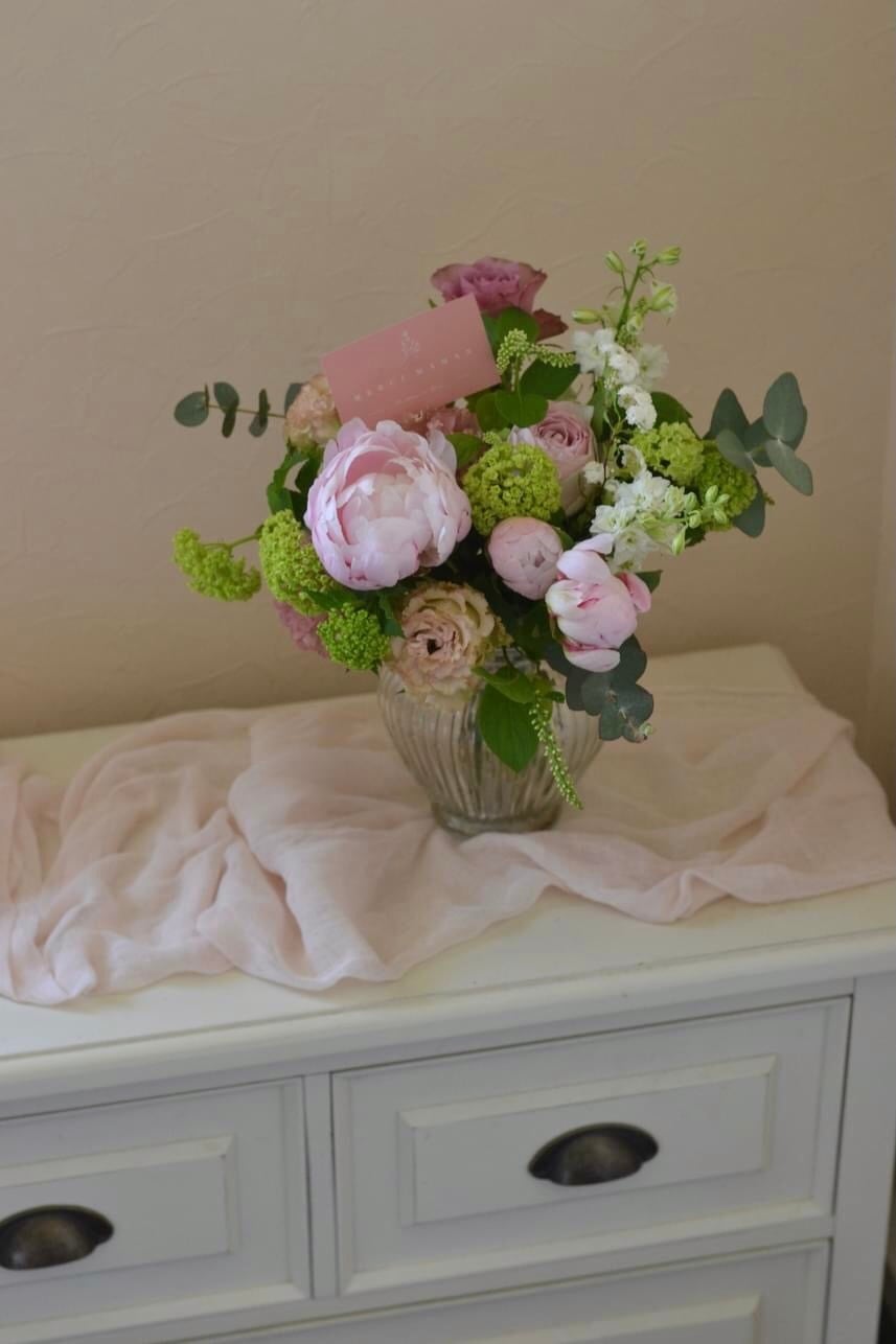柔らかい色のバラや季節の花を入れてその時に綺麗な花をピックアップ。
